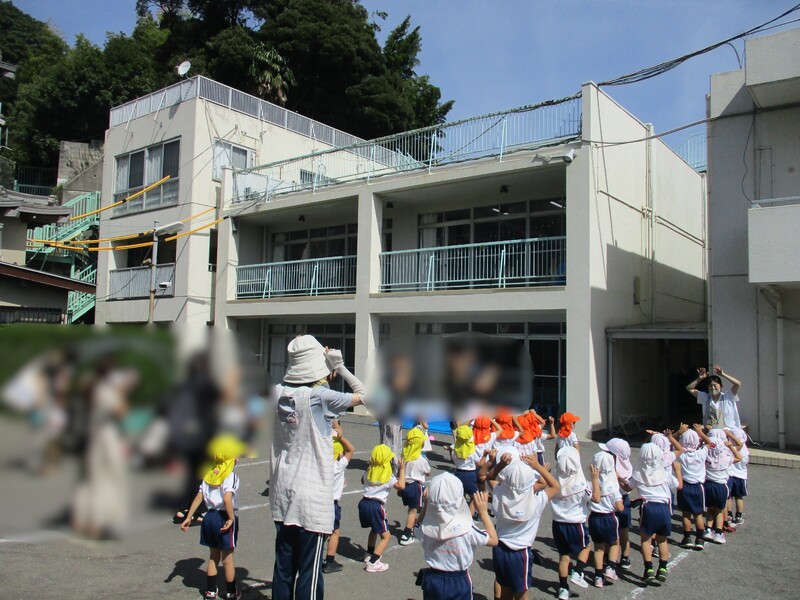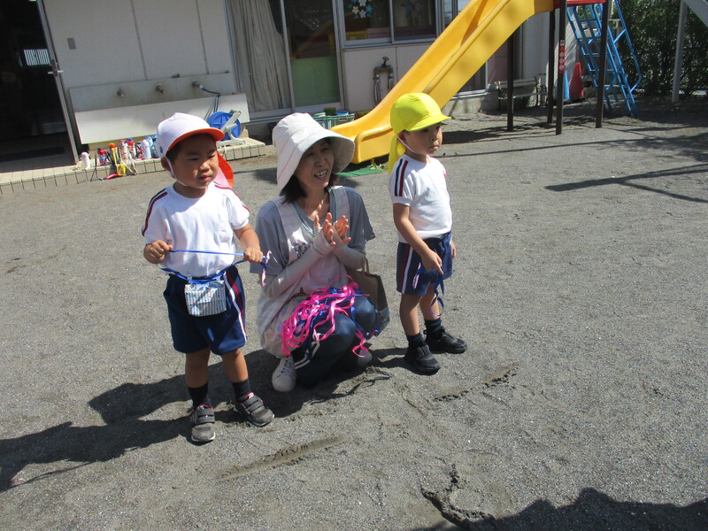 当日はお暑い中、朝早くからお集まりいただきありがとうございました。第二幼稚園の年少ちゅうりっぷ組・たんぽぽ組のおともだちも小さいお友達と一緒に体操したり、遊べることを楽しみにしていました。年少組のおともだちトンネルをくぐって、一緒に『どうぶつたいそう』をして体を動かした後、お庭でお砂遊びをしたり、ケンケンパをしたりして交流を深めました。最後はみんなで『バイバイ✋』また遊びに来てくださいね💕
