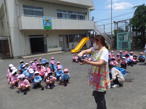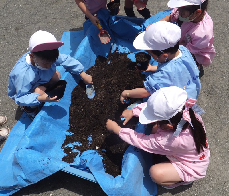 年長さんみんなで、ミニひまわりの種まきをしました。
