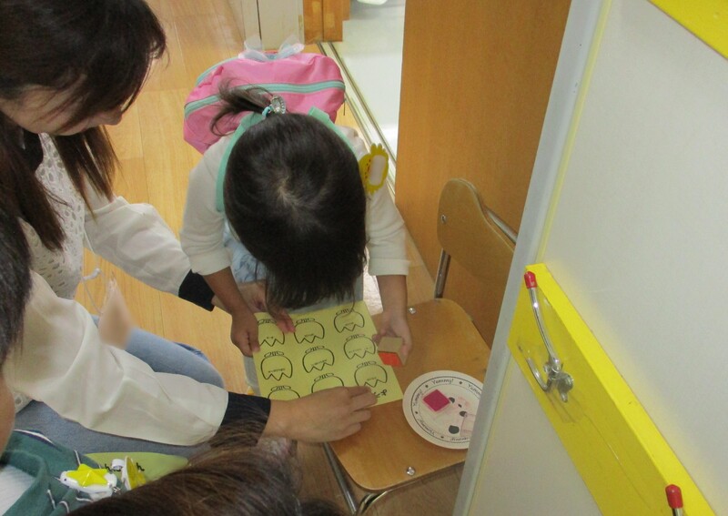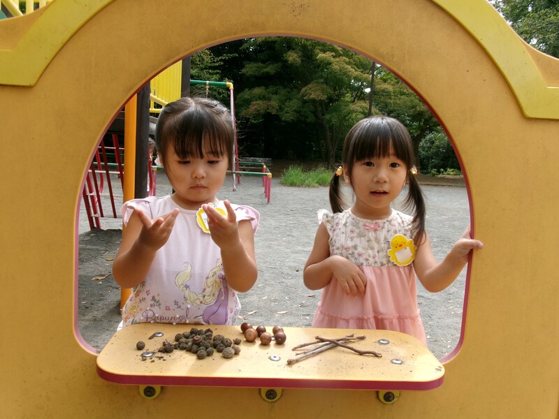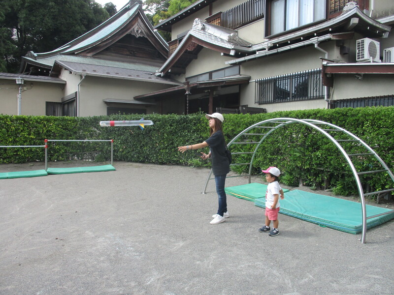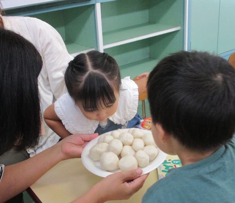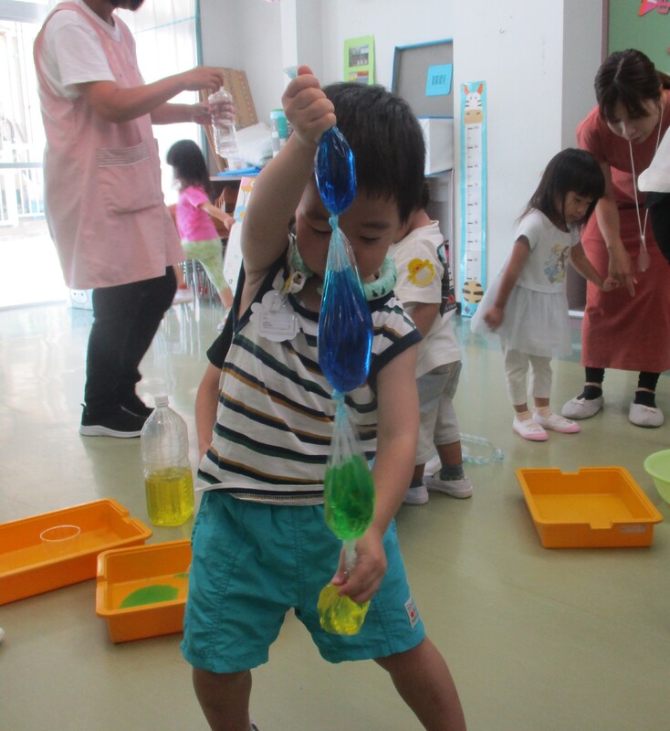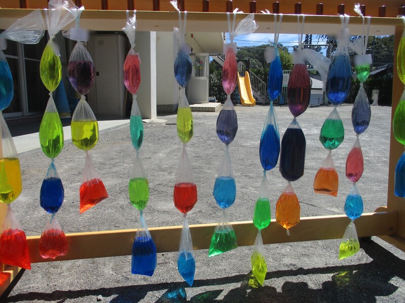 色水遊びでは、大好きな色を選んだり混ぜたらどんな色になるかな?と、楽しみながら傘袋に入れて…色水のカーテンが出来ました✨同じ傘さ袋を使っての製作ではビニールに絵をかいてロケットの完成🚀園庭で飛ばしてみんな笑顔😊十五夜を前にしてみんなでお団子づくり!ゆでた後香りをかいだら…「食べたい‼!」となり、お月様より一足先にみたらしだんごを食べました。もちろんお月様もどうぞ!とお団子をお供えしました🎑綱島公園にお散歩に行ってみんなでドングリを拾ったり遊具で遊んだりと、たくさん楽しんできました!幼稚園って広いよね〜と、スタンプラリーをしながら幼稚園探検をしました💚
