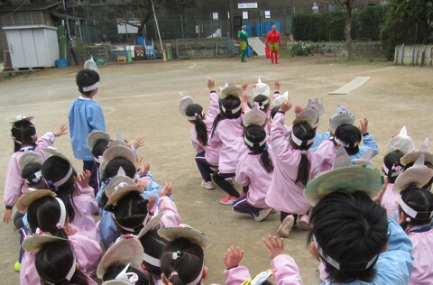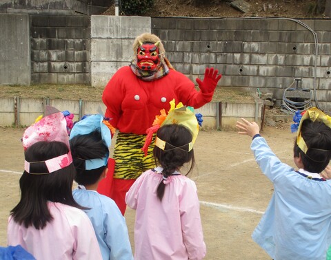 元気いっぱい登園した子ども達でしたが、豆まきの時間が近づくにつれ緊張している様子が見られました。