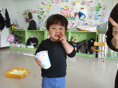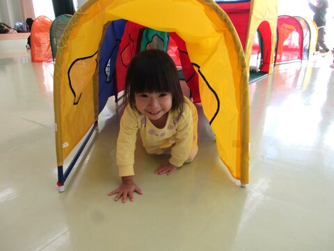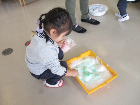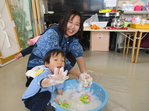 わくわくdayでは、幼稚園のお友だちのとんねるでお出迎えしてもらったあと、折り紙のプレゼントをもらいました。1回目の『泡で遊ぼう』は石鹸とスポンジボールでたっぷりの泡を作って色を付けたり、ジュースにして楽しみました。2回目はトンネルの遊具とボールプールで遊びました😊