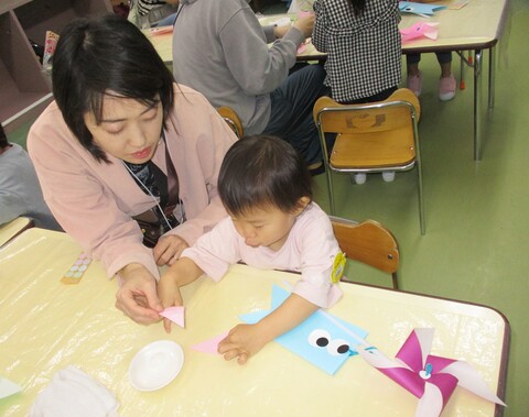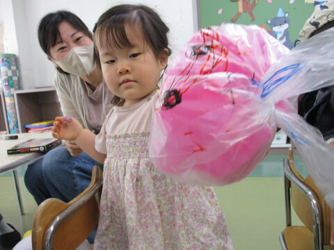 入園式…初めてのお名前呼びで「はーい!」ってお返事したり、ケーキの絵本を読みました。移動動物園が幼稚園に来た日には、動物さんに餌をあげられました。こいのぼりをつくって、かざくるまと一緒に飾ってふーぅ。「わーい!かざくるまがまわった!」と大喜び!しゃぼん玉遊びはうちわでしゃぼん玉を作ったり、大きなしゃぼん玉を作ったりして、何回も試して楽しんでいました。もちろん大人もはまります😊作って遊ぼうでは親子で楽しんだ後みんなでバ作った🐰さんをビニールの上にのせてピョンピョンジャンプさせてあげました。